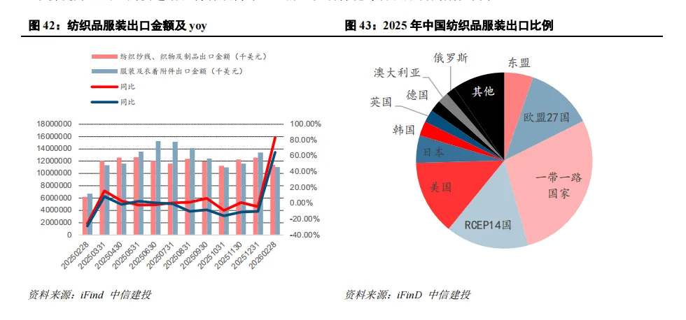 出口高增长主要受多重因素共振驱动:一是2026年春节较去年显著后移,节前集中赶工出货阶段性推高出口数据;二是去年同期基数偏低,进一步放大同比增速;三是全球需求边际回暖,叠加纺织品原料涨价带动出口单价提升。出口的快速增长将有效传导至上游,拉动棉花等纺织原料的刚性需求。