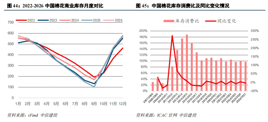 库消比方面,中国棉花近年来库消比相对稳定,预计2026/27库存消费比同比小幅下降,这是因为在进口调控作用下期末库存整体较为平稳。在全球减产的大背景下,高库存消化是渐进过程。减产向库消比的实质性传导仍需时间,供需从宽松向紧平衡的切换仍在进行中。