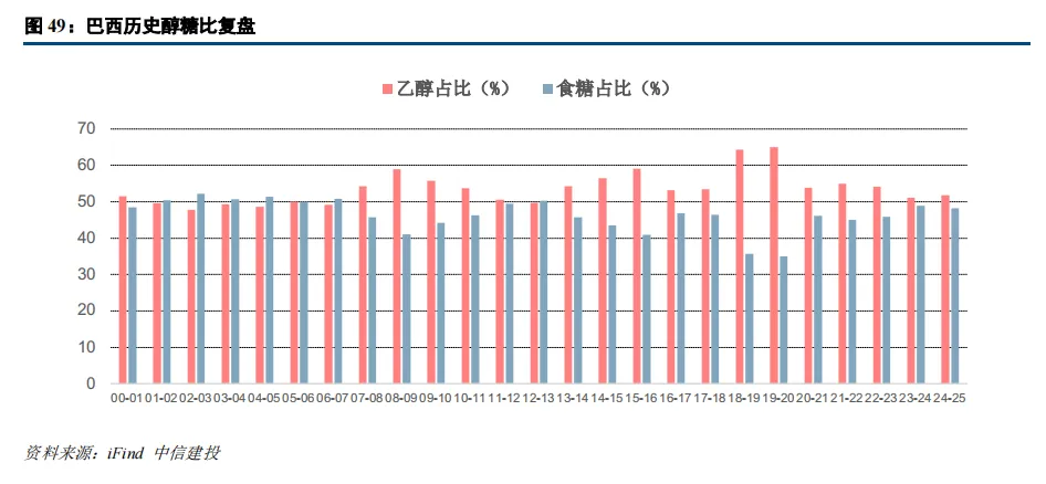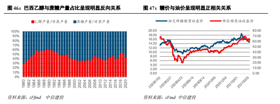 白糖市场的最核心逻辑在于巴西糖醇配比调整,使得白糖价格与油价呈现正相关关系。巴西作为全球最大的糖生产国和出口国,其糖厂加工系统可在生产白糖与乙醇之间切换。白糖主要来自甘蔗,而甘蔗同时是生产乙醇的核心原料,当原油性价比低于乙醇时,工厂会将更多甘蔗用于生产乙醇,导致白糖供应减少,价格上涨。