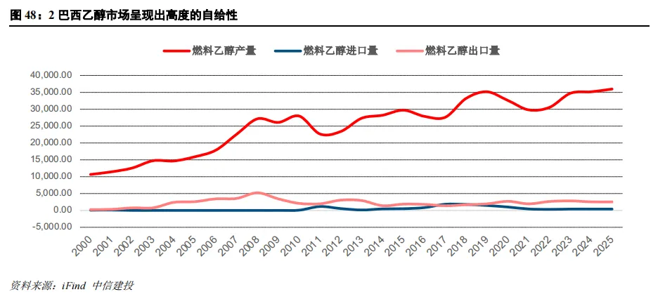 巴西乙醇市场呈现高度自给自足特征,糖醇转换机制畅通。首先,燃料乙醇主供自给使乙醇—白糖替代关系不受外部变量干扰,比价与制醇比例的传导机制稳定;其次,巴西灵活燃料汽车占比超85%,可实时切换乙醇与汽油,终端需求传导渠道高度畅通,乙醇分流对制糖比的压制效应可高效、顺畅地传导至糖厂生产决策。