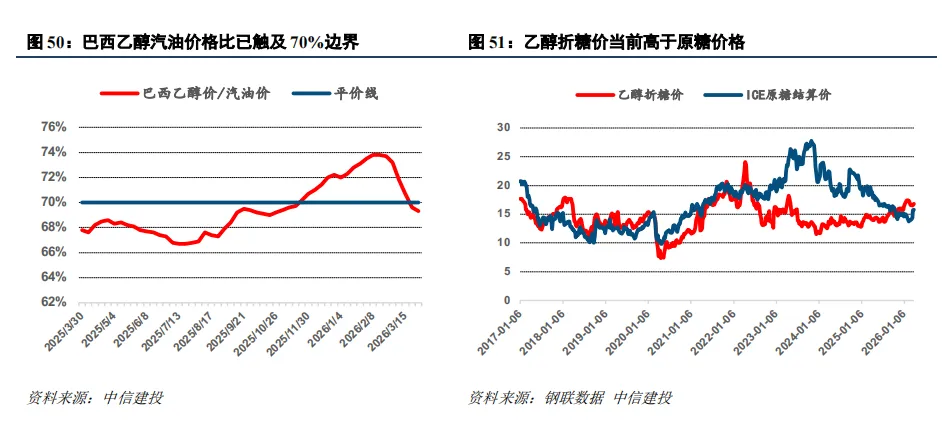 当前巴西乙醇价格走高,折价后高于汽油价格与糖价,制醇比预期上升。当前巴西乙醇汽油价格比已触达临界值70%,这是驱动糖市供给收缩的结构性拐点。巴西终端车主可实时切换乙醇与汽油,只有当乙醇价格≤汽油价格的 70% 时,乙醇才具备足够的性价比,成为车主的优先选择。当前随着国际油价高位运行,巴西乙醇平价指标已突破 70% ,乙醇性价比的持续提升驱动糖厂将甘蔗原料从制糖环节转向乙醇生产,推动 2026 年糖价中枢上移。当前巴西乙醇折糖价为16.78美分/磅,ICE原糖价格为15.76美分/磅,价差驱动巴西厂商转向生产乙醇。