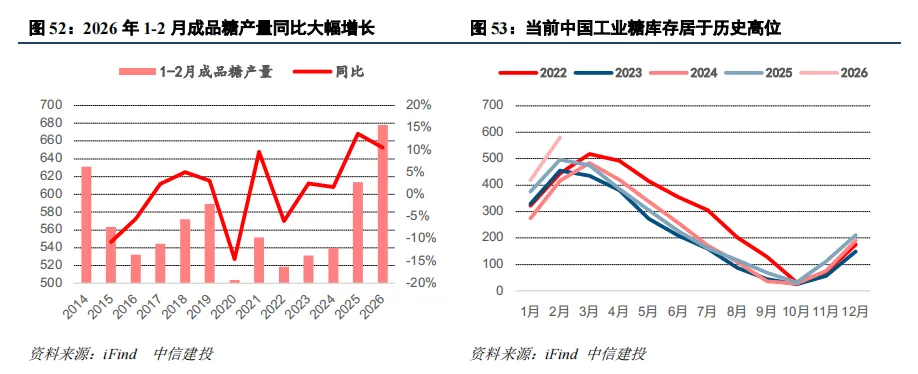 2026 年 1-2 月我国糖市场呈现产量激增、库存高企的格局,丰产预期将对糖价形成压制。1-2 月成品糖产量高达 677 万吨,同比大幅增长 11.4%,供应端的放量态势明显。而 2 月工业库存攀升至 581 万吨,创下近年来历史高位,后续去库压力较大,国际糖业组织最新报告中,2025/26榨季全球食糖产量预计1.8129亿吨,消费量预计1.8007亿吨,过剩122万吨。