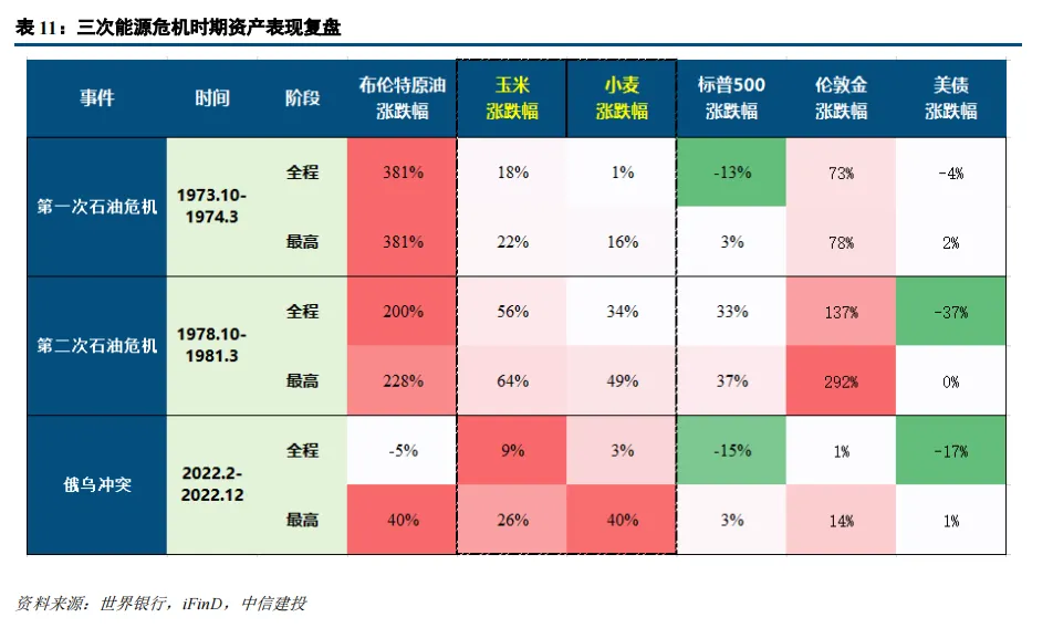 复盘过往三次石油危机与俄乌冲突,我们发现在全球性能源供给冲击事件中,相较于其他资产类别,粮食品种虽非涨幅最高的板块,但始终表现出显著的价格韧性,抗跌属性突出。这主要源于以下两个核心特征:
