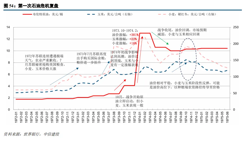 价格弹性与节奏:粮食启动上涨滞后1-2月,整体跟随原油。1973年10月战争爆发后,原油启动较快,仅当月便相对9月份价格涨幅达50%以上。尽管原油启动较快,但缘于农资成本传导的滞后性,以及前期苏联粮食危机带来的较大涨幅积累,玉米和小麦价格上涨较为滞后,至1974年1-2月才有相对可观涨幅。