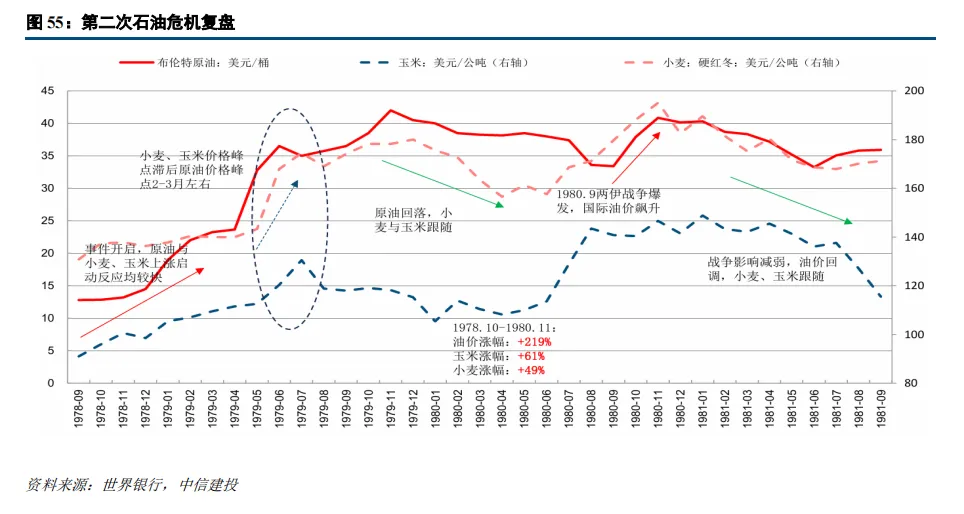 价格弹性与节奏:粮食上涨跟随较快,阶段性峰点滞后油价2-3月,期间基本与原油价格同涨同跌。原油自1978年底启动后,至1979年5月已有160+%涨幅。油价暴涨带动化肥等农资价格上涨,粮食种植成本上升。整体而言,玉米相对小麦跟随较快,且涨幅弹性也更大。
