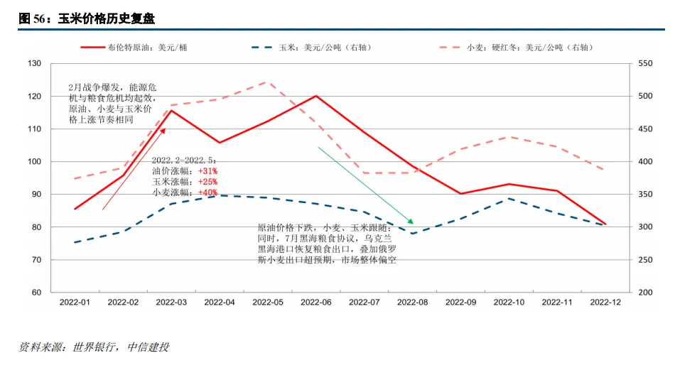 2022年7 月联合国、土耳其斡旋下签署黑海粮食协议,乌克兰黑海港口恢复粮食出口,核心供给约束解除,同时当年俄罗斯小麦迎来大丰收,出口量超市场预期,全球小麦供给紧张格局大幅缓解。需求端,全球经济衰退预期升温,粮食消费需求略微疲软,供需格局持续逆转。2022年年底,小麦与玉米价格基本回到年初冲突前水平。