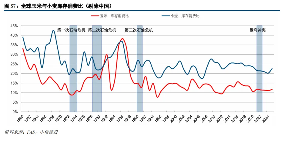 复盘三次历史冲击,低库存环境更有利于农产品行情催化。第一、二次石油危机期间,玉米与小麦库消比均处历史低位,叠加化肥库存紧张,成本传导顺畅;俄乌冲突则呈现能源与粮食双重供给冲击,叠加俄罗斯作为化肥出口大国,初期粮价快速反应,弹性更大。