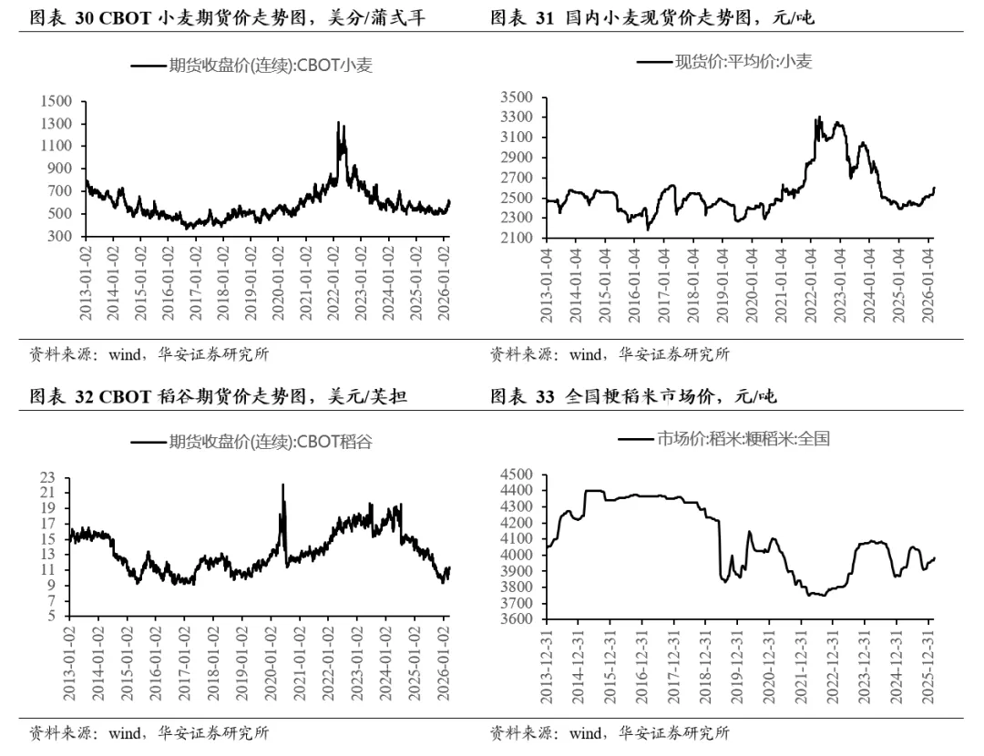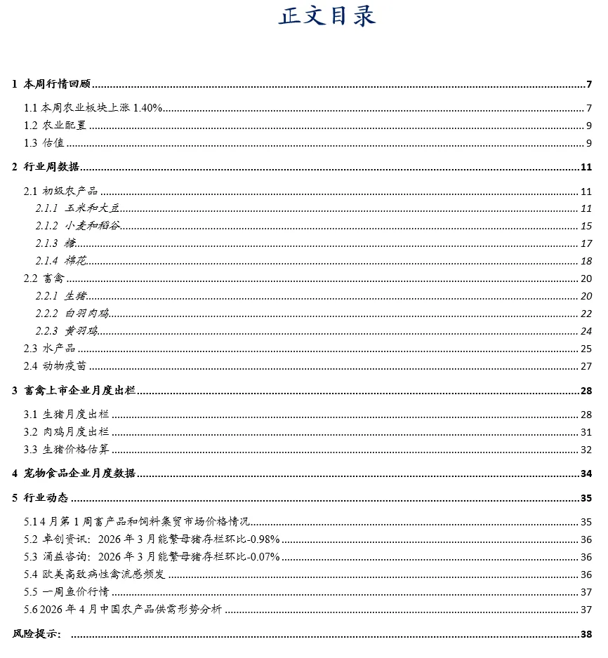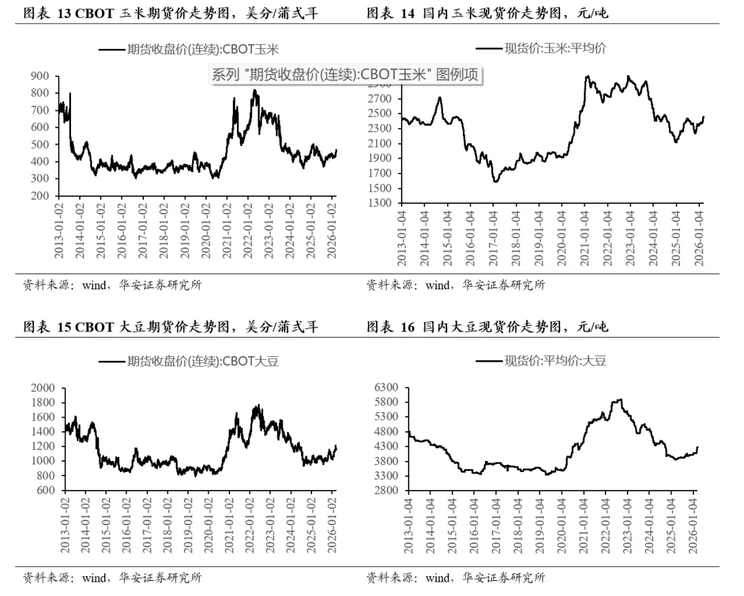 l 25/26年全球小麦、玉米库消比预测值环比上升,大豆环比下降①25/26全球玉米库消比预测值处环比+0.1pct。USDA4月供需报告预测:25/26年全球玉米库消比19.5%,同比-1.1pct,环比+0.1pct,处15/16年以来最低水平。中国农业农村部市场预警专家委员会月报:4月对中国玉米供需形势预测与3月一致,25/26年结余变化821万吨,较24/25年大幅上升932万吨;今年春季东北气温偏高,玉米春播可能较常年提前,主产区售粮进度超八成,生猪存栏量处于高位,饲用需求旺盛,但生猪养殖亏损加剧,叠加饲用和深加工企业原料库存增加、采购谨慎,玉米价格略有回落;②25/26全球小麦库消比预测值环比+0.7pct。USDA4月供需报告预测:25/26年度全球小麦库消比27.2%,同比+1.8pct,环比+0.7pct,处22/23年以来偏高水平;③25/26全球大豆库消比预测值环比-0.1pct。USDA4月供需报告预测:25/26年度全球大豆库消比20.4%,同比-0.5pct,环比-0.1pct,处于19/20以来偏高水平。中国农业农村部市场预警专家委员会月报:4月对中国大豆供需形势预测与3月一致,25/26年结余变化241万吨,较24/25年大幅下降897万吨;国内方面,东北地区春播临近,基层售粮意愿提升,叠加国产大豆持续拍卖,市场有效供给增加,近期随着蔬菜、猪肉价格下跌,豆制品需求受到阶段性抑制;国际方面,南美大豆进入收获后期与出口旺季,产量有望再创历史新高,全球大豆供应维持宽松格局,能源市场震荡成为影响短期国际大豆价格的关键变量。1 本周行情回顾