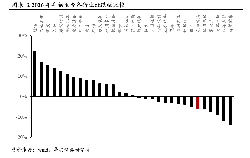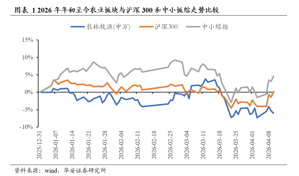2026年初至今,农林牧渔在申万31个子行业中排名第26位,农林牧渔(申万)指数下跌6.00%,沪深300指数上涨0.14%,中小板综指数上涨4.57%。
