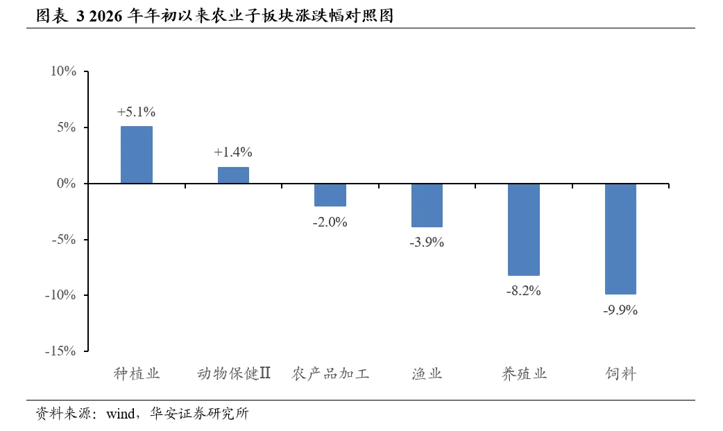 2026年初至今,农业各子板块涨幅从高到低依次为种植业(+5.1%)、动物保健Ⅱ(+1.4%)、农产品加工(-2.0%)、渔业(-3.9%)、养殖业(-8.2%)、饲料(-9.9%)。