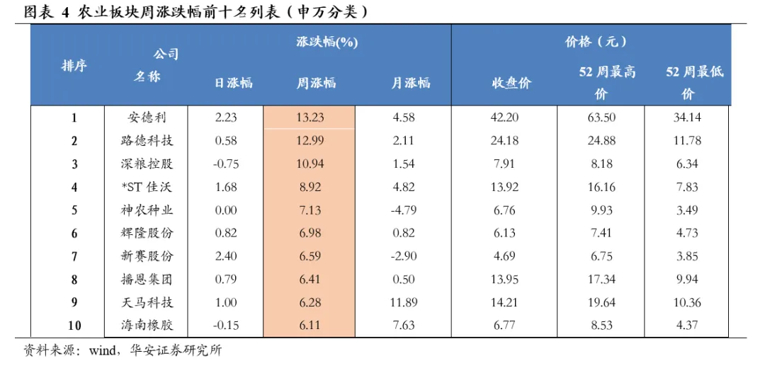 本周(2026年4月6日-2026年4月10日)农林牧渔(申万)指数上涨1.40%,沪深300指数上涨4.41%,中小板综指数上涨6.17%,农业指数跑输沪深300指数3.01个百分点。