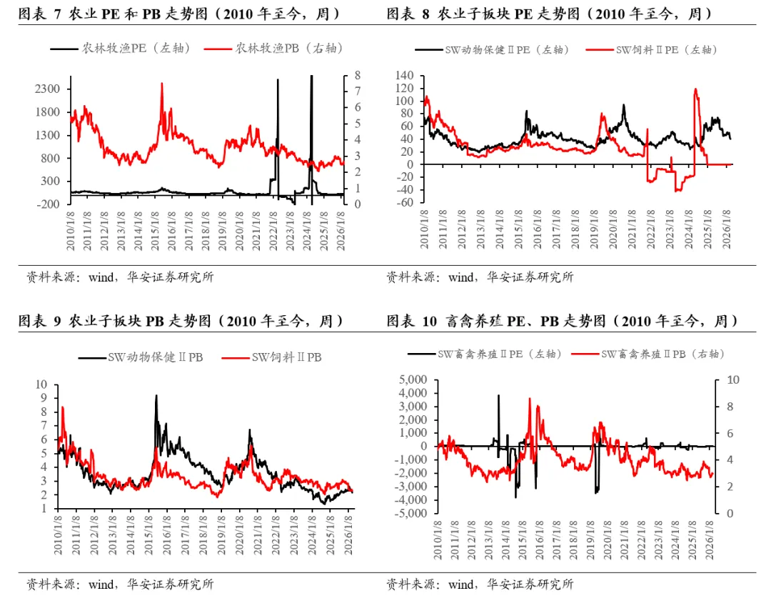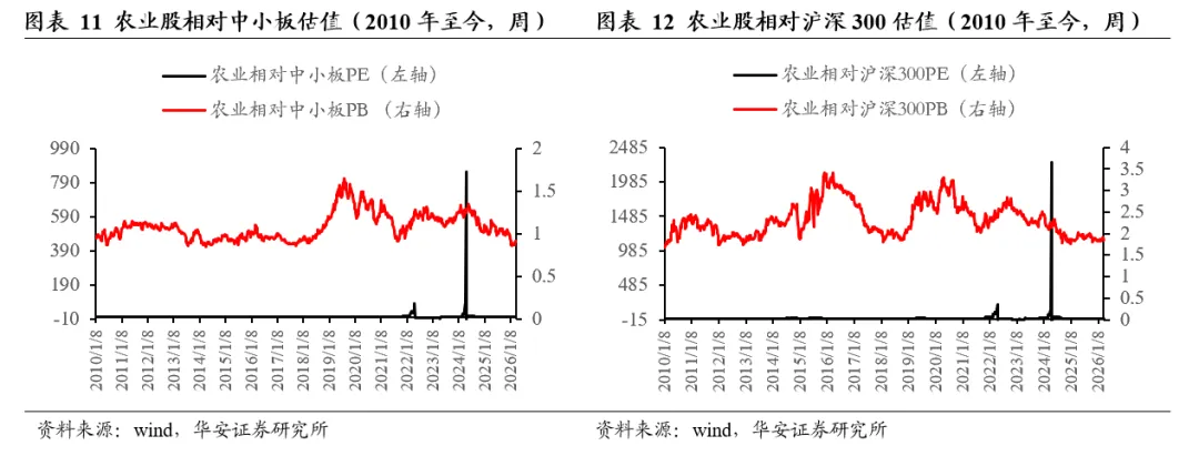 2026年4月10日,农业板块绝对PE和绝对PB分别为31.82倍和2.40倍,2010年至今农业板块绝对PE和绝对PB的历史均值分别为108.25倍和3.54倍;农业板块相对中小板PE和PB分别为0.74倍和0.85倍,历史均值分别为3.06倍和1.09倍;农业板块相对沪深300 PE和PB分别为2.24和1.79倍,历史均值分别为9.22倍和2.34倍。