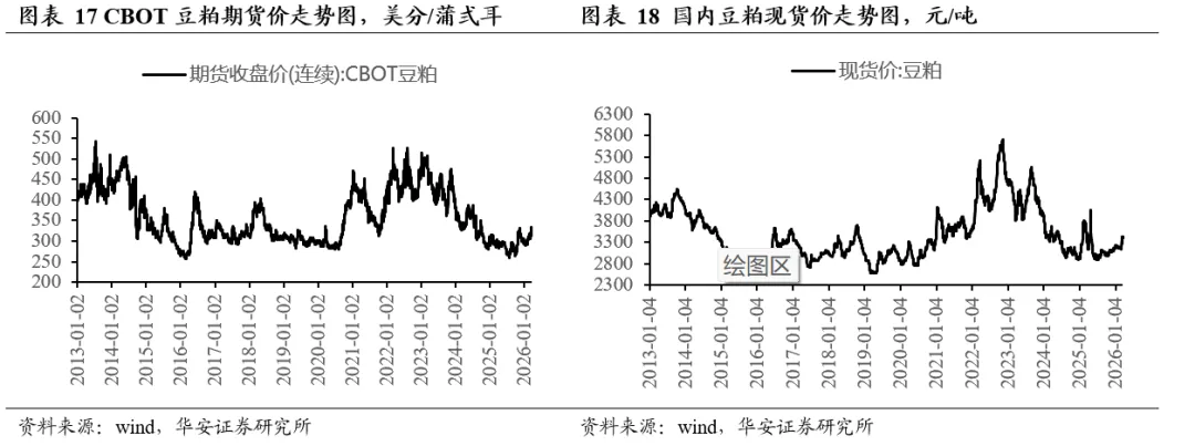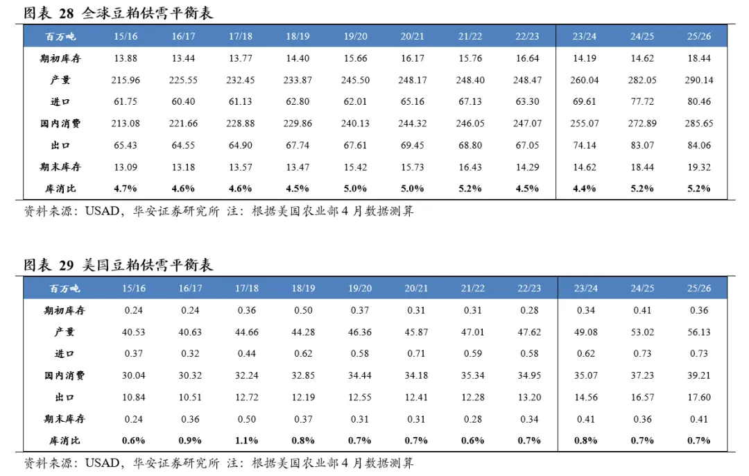美国农业部2026年4月供需报告预测,2025/26年度全球豆粕产量2.90亿吨,国内消费量2.86亿吨,期末库存1,932万吨,库消比5.2%,较24/25年度上升0.05个百分点。2025/26年度美国豆粕产量5,613万吨,国内消费量3,921万吨,期末库存41万吨,库消比0.7%,较24/25年度上升0.05个百分点。