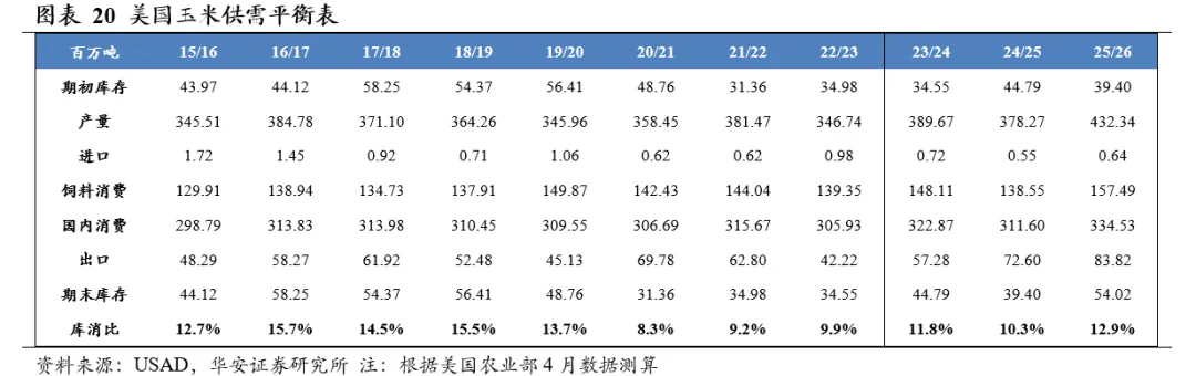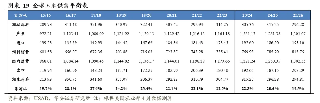 美国农业部2026年4月供需报告预测,2025/26年度(12月至次年11月)全球玉米产量13.01亿吨,国内消费量13.03亿吨,期末库存2.95亿吨,库消比19.5%,预测值较24/25年度下降1.08个百分点。