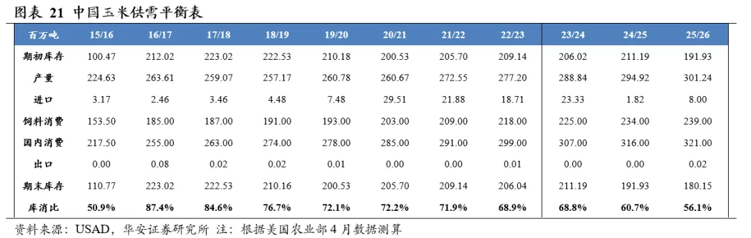 分国别看,2025/26年度美国玉米产量4.32亿吨,国内消费量3.35亿吨,期末库存5,402万吨,库消比12.9%,较24/25年度上升2.66个百分点;2025/26年度中国玉米产量3.01亿吨,国内消费量3.21亿吨,期末库存1.80亿吨,库消比56.1%,较24/25年度下降4.62个百分点。