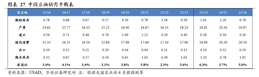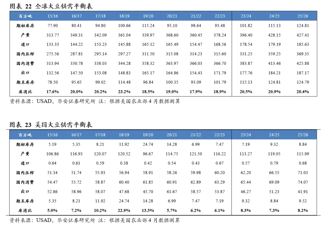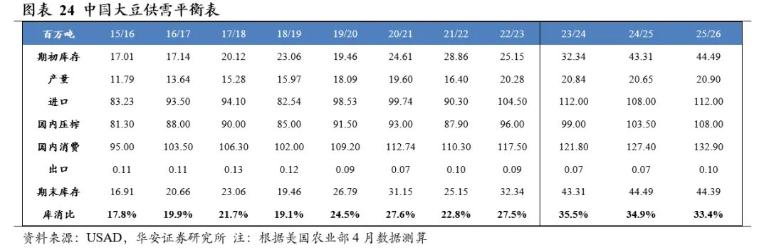 分国别看,2025/26年度美国大豆产量1.16亿吨,国内消费量7,407万吨,期末库存952万吨,库消比8.2%,较24/25年度上升0.86个百分点;2025/26年度中国大豆产量2,090万吨,国内消费量1.33亿吨,期末库存4,439万吨,库消比33.4%,较24/25年度下降1.53个百分点。