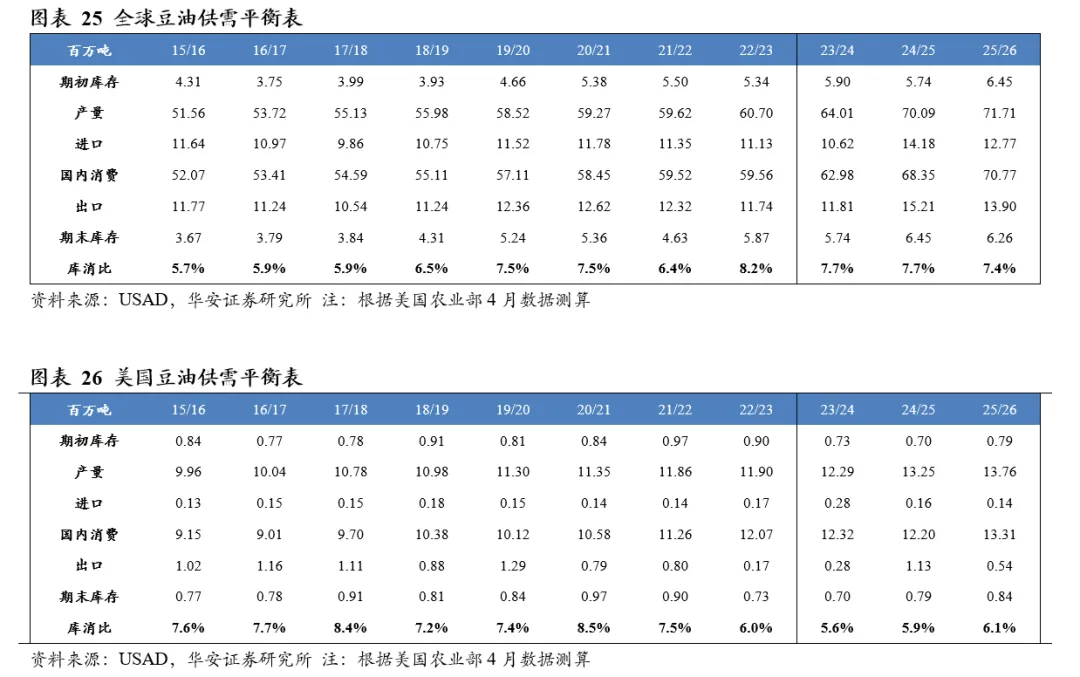 美国农业部2026年4月供需报告预测,2025/26年度全球豆油产量7,171万吨,国内消费量7,077万吨,期末库存626万吨,库消比7.4%,较24/25年度下降0.33个百分点。