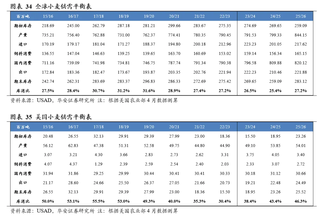 美国农业部2026年4月供需报告预测,2025/26年度全球小麦产量8.44亿吨,国内消费量8.20亿吨,期末库存2.83亿吨,库消比27.2%,较24/25年度上升1.78个百分点。