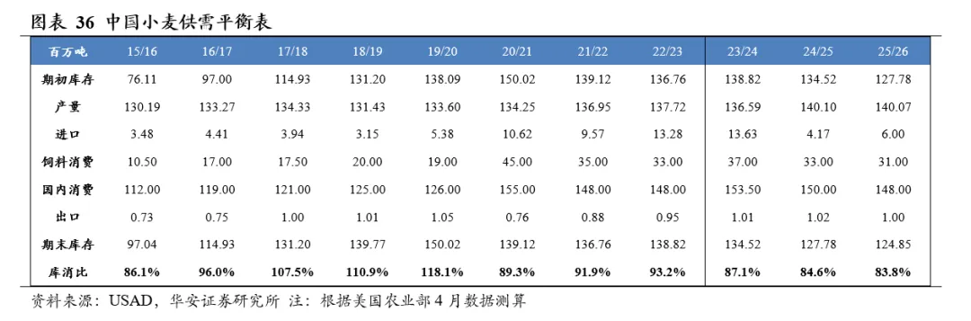 分国别看,2025/26年度美国小麦产量5,401万吨,国内消费量3,066万吨,期末库存2,552万吨,库消比46.3%,较24/25年度上升2.88个百分点;2025/26年度中国小麦产量1.40亿吨,国内消费量1.48亿吨,期末库存1.25亿吨,库消比83.8%,较24/25年度下跌0.82个百分点。