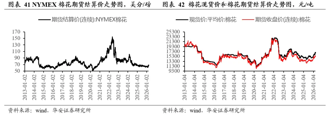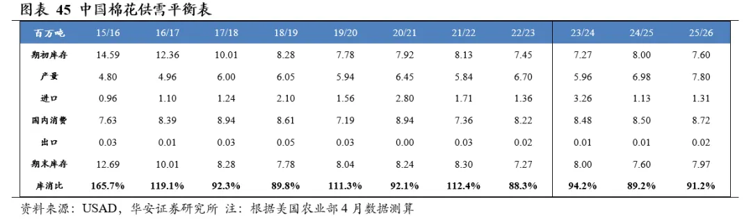 分国别看,2025/26年度美国棉花产量303万吨,国内消费量35万吨,期末库存96万吨,库消比32.4%,较24/25年度上升3个百分点;2025/26年度中国棉花产量774万吨,国内消费量861万吨,期末库存793万吨,库消比91.2%,较24/25年度上升2个百分点。
