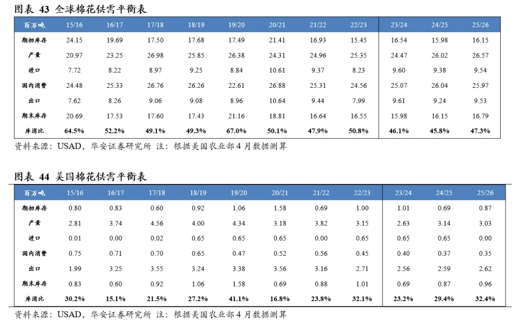 美国农业部2026年4月供需报告预测,2025/26年度全球棉花产量2,638万吨,国内消费量2,585万吨,期末库存1,665万吨,库消比47.3%,较24/25年度上升1.5个百分点。