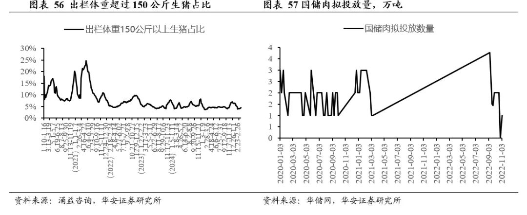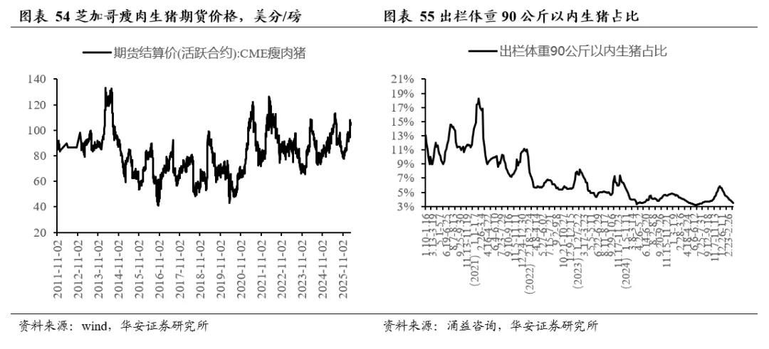 ②生猪出栏均重出现回落。涌益咨询(4.3-4.9):全国出栏生猪均重128.61公斤,周环比-0.2公斤,较2024年、2025年同期分别+2.58公斤、-0.2公斤;150kg以上生猪出栏占比4.7%,周环比-0.04pct,较2024年、2025年同期-1.77pct、-0.24pct;175kg、200kg与标猪价差分别为0.71元/斤、1.3元/斤;