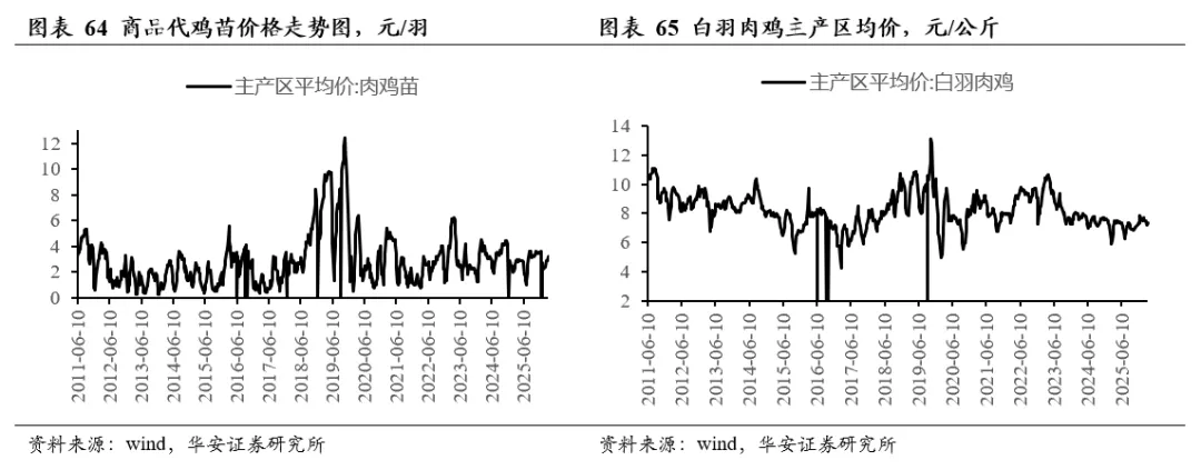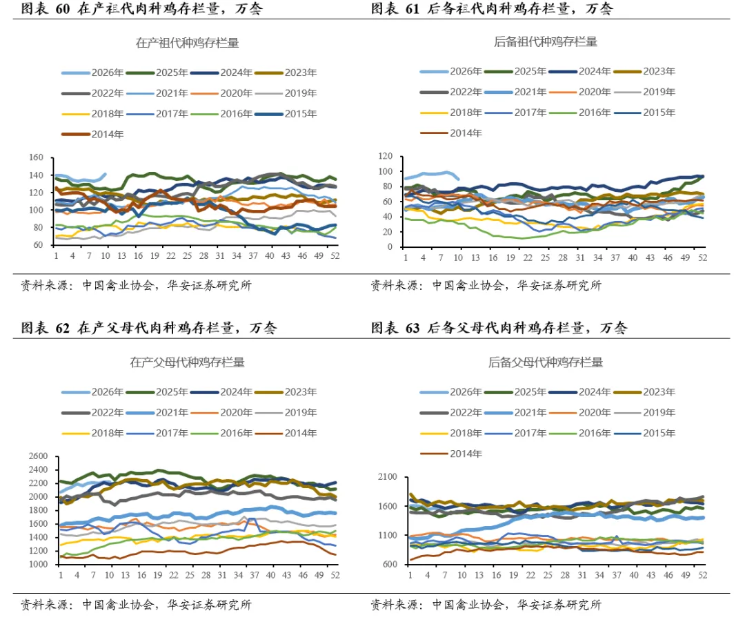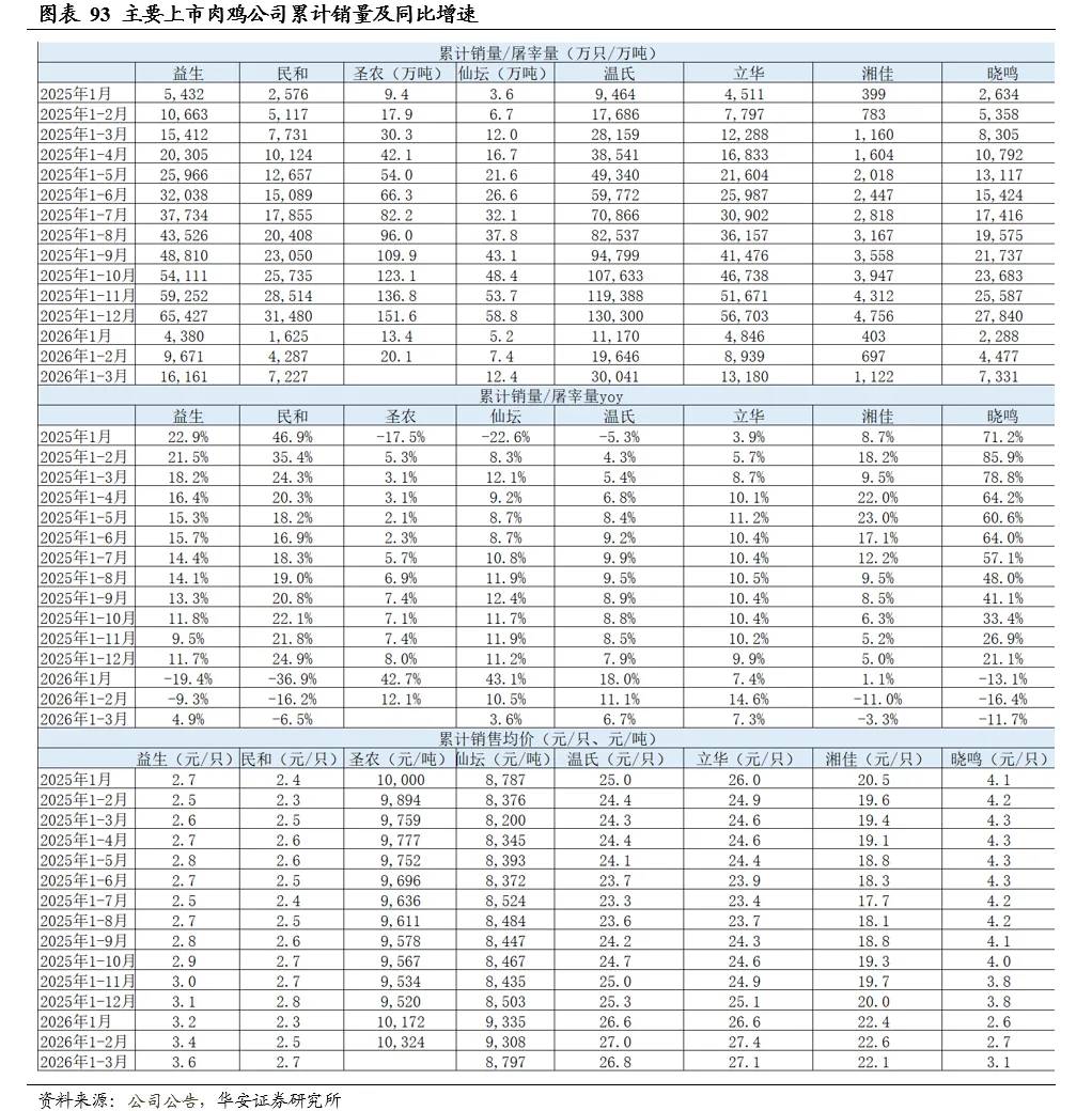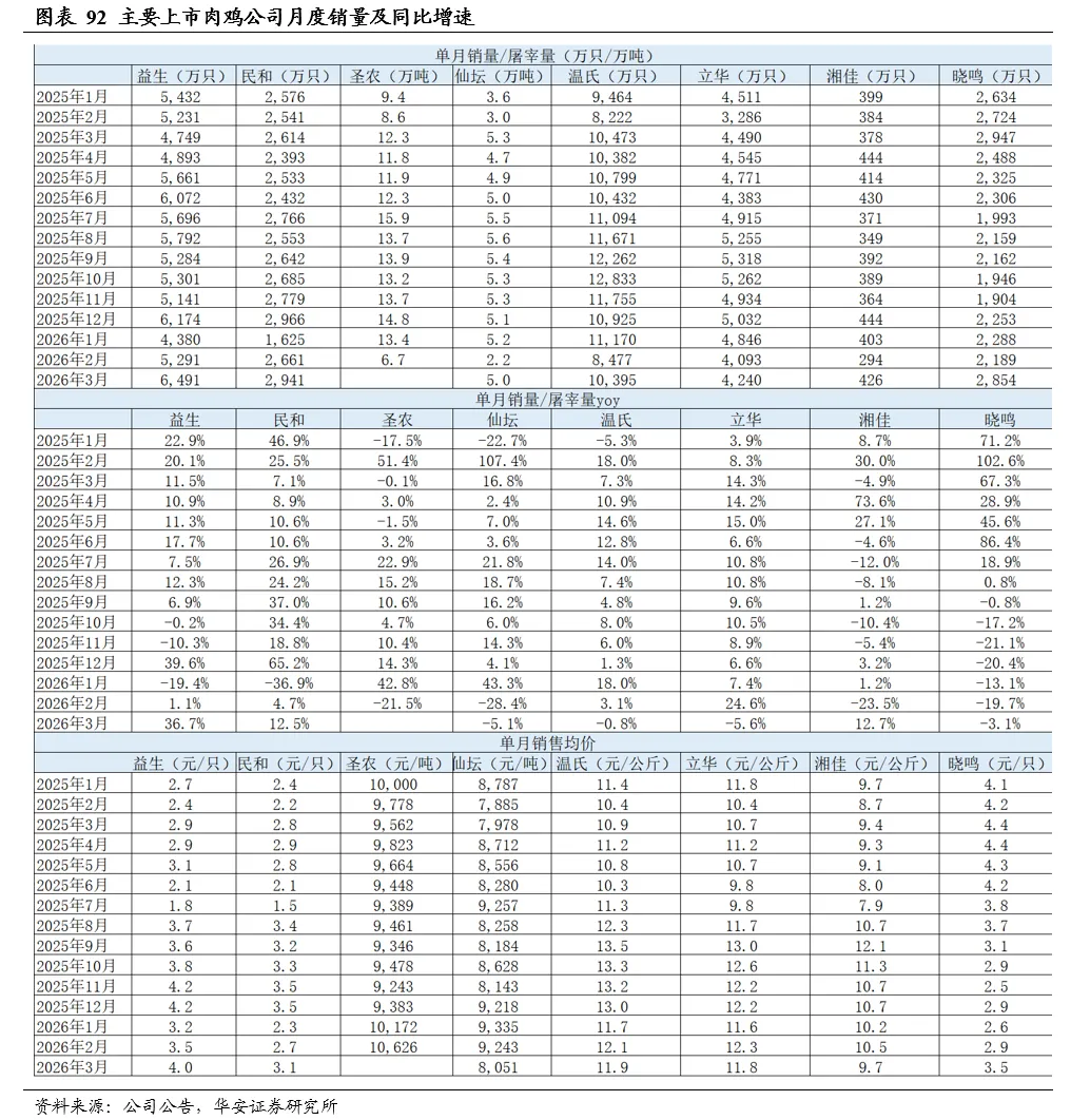 l 白羽鸡产品吨价降至8850元,黄羽鸡养殖连续盈利8个月①白羽鸡产品吨价降至8850元。本周五,鸡产品价格8,850元/吨,周环比-1.1%,同比-0.6。2026年第12周(3.23-3.29):在产祖代种鸡存栏量145.65万套,周环比+0.1%,处于2019年以来同期最高;在产父母代种鸡存栏量2216.46万套,周环比-0.9%,低于2025年同期水平;父母代鸡苗销量185.13万套,周环比-5.3%,同比+26%;父母代鸡苗价格47.06元/套,周环比-3.6%,同比+14%;