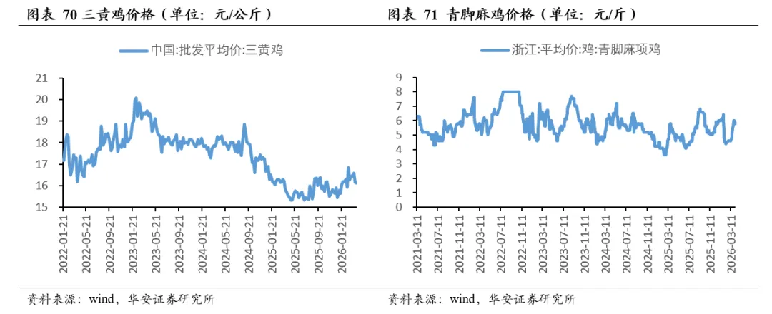 2026年4月10日,三黄鸡均价16.13元/公斤,周环比跌0.06%,同比涨1.96%;2026年4月8日,青脚麻鸡均价5.80元/斤,周环比跌3.33%,同比涨7.41%。