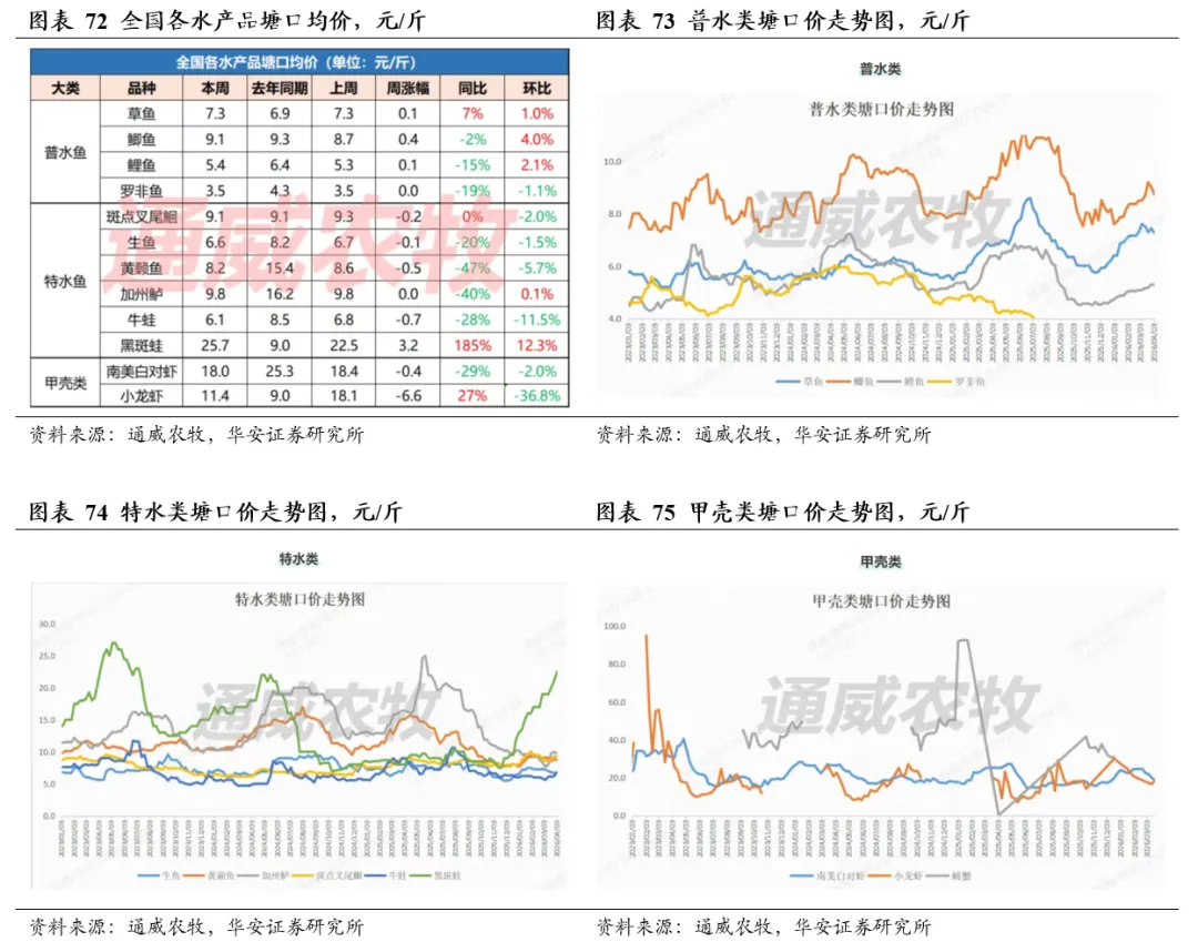 本周主要上涨的品种是草鱼、鲫鱼、鲤鱼、黑斑蛙;主要下跌的品种是罗非鱼、斑点叉尾鮰、生鱼、黄颡鱼、牛蛙、南美白对虾、小龙虾;加州鲈行情与上周基本持平。(来源:通威农牧)