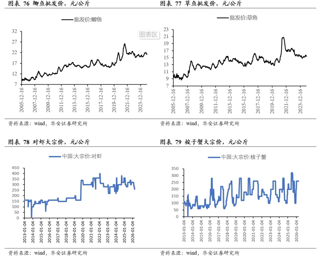 2026年4月3日,鲫鱼批发价21.35元/公斤,周环比涨0.14%,同比涨1.57%;草鱼批发价17.07元/公斤,周环比跌0.12%,同比涨9.56%。