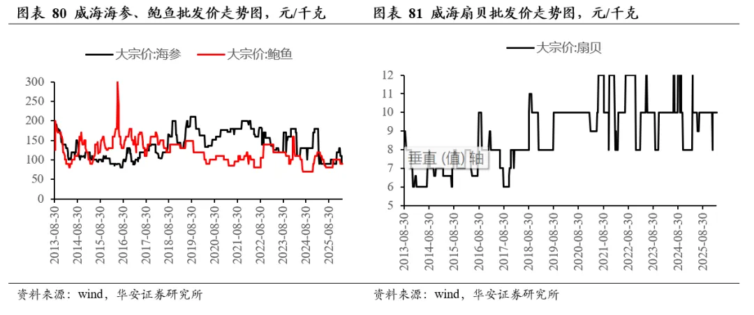 2026年4月10日,威海海参批发价80元/千克,周环比跌11.11%,同比跌11.11%;威海鲍鱼批发价90元/千克,周环比持平,同比跌25.00%;威海扇贝批发价12元/千克,周环比涨20.0%,同比涨20.0%。