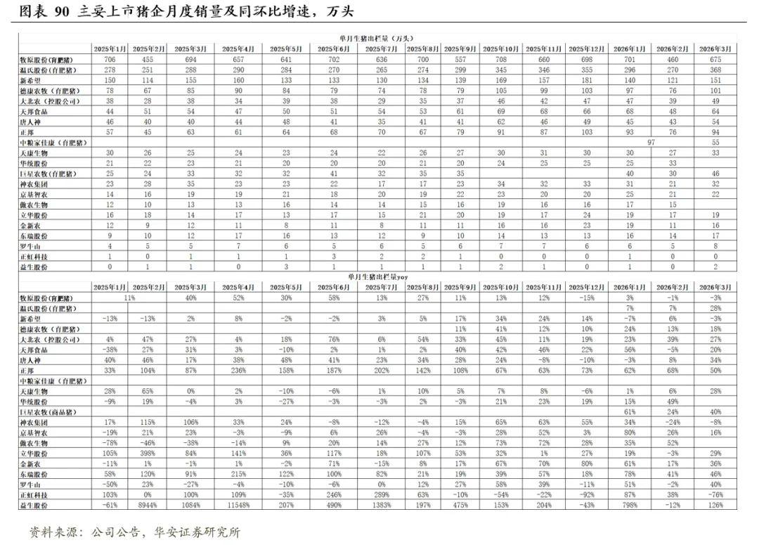 2026年3月,17家上市猪企出栏量1,748万头,同比+11.1%,出栏量(万头)从高到低依次为,牧原675(育肥猪)、温氏368(育肥猪)、新希望151、德康农牧(育肥猪)101、正邦94、天邦食品64、唐人神54、大北农(控股公司)49、巨星农牧46、天康生物33、神农集团32、京基智农22、立华股份19、东瑞17、金新农16、罗牛山8、正虹科技0;出栏量同比增速从高到低依次为,正邦50%、东瑞46%、巨星农牧40%、罗牛山40%、金新农36%、唐人神34%、立华股份29%、温氏28%、天康生物28%、大北农(控股公司)27%、天邦食品20%、德康农牧18%、京基智农16%、牧原-3%、新希望-3%、神农集团-8%、正虹科技-76%。