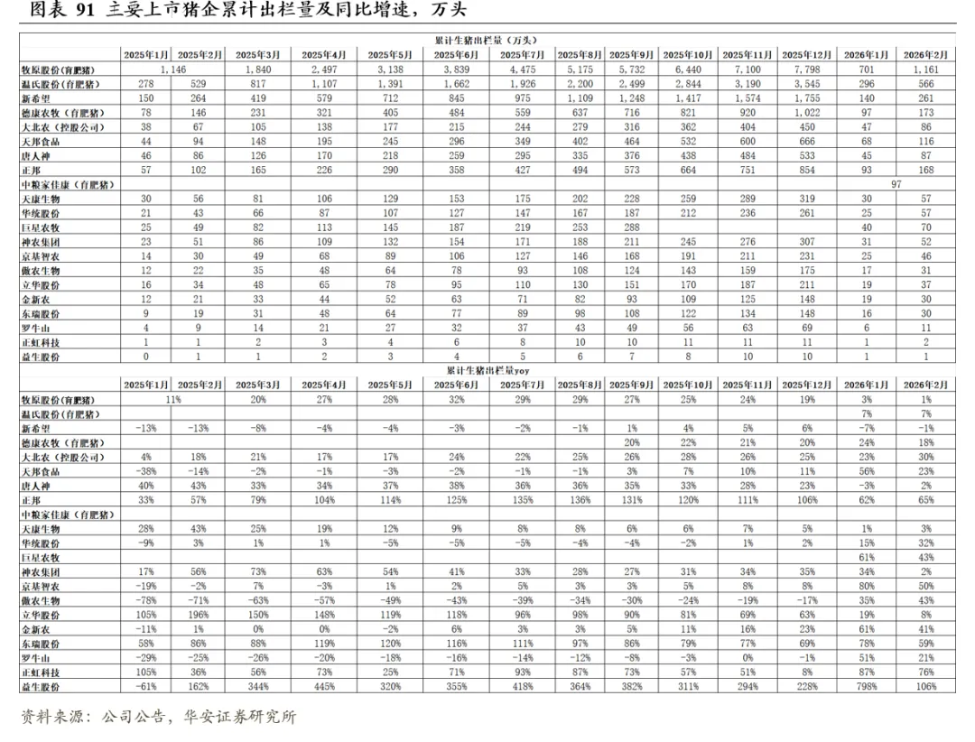 2026年1-3月,17家上市猪企出栏量4,703万头,同比+9.9%,出栏量(万头)从高到低依次为,牧原1836(育肥猪)、温氏934(育肥猪)、新希望412、德康农牧(育肥猪)273、正邦262、天邦食品181、唐人神142、大北农(控股公司)135、巨星农牧116、天康生物90、神农集团84、京基智农67、立华股份55、东瑞48、金新农46、罗牛山18、正虹科技2;出栏量同比增速从高到低依次为,正邦59%、东瑞54%、巨星农牧42%、金新农39%、京基智农37%、大北农(控股公司)29%、罗牛山28%、天邦食品22%、德康农牧18%、立华股份14%、温氏14%、唐人神12%、正虹科技12%、天康生物11%、牧原0%、神农集团-2%、新希望-2%。