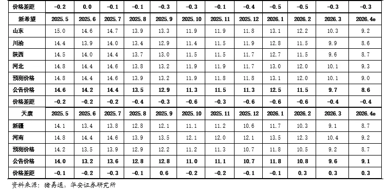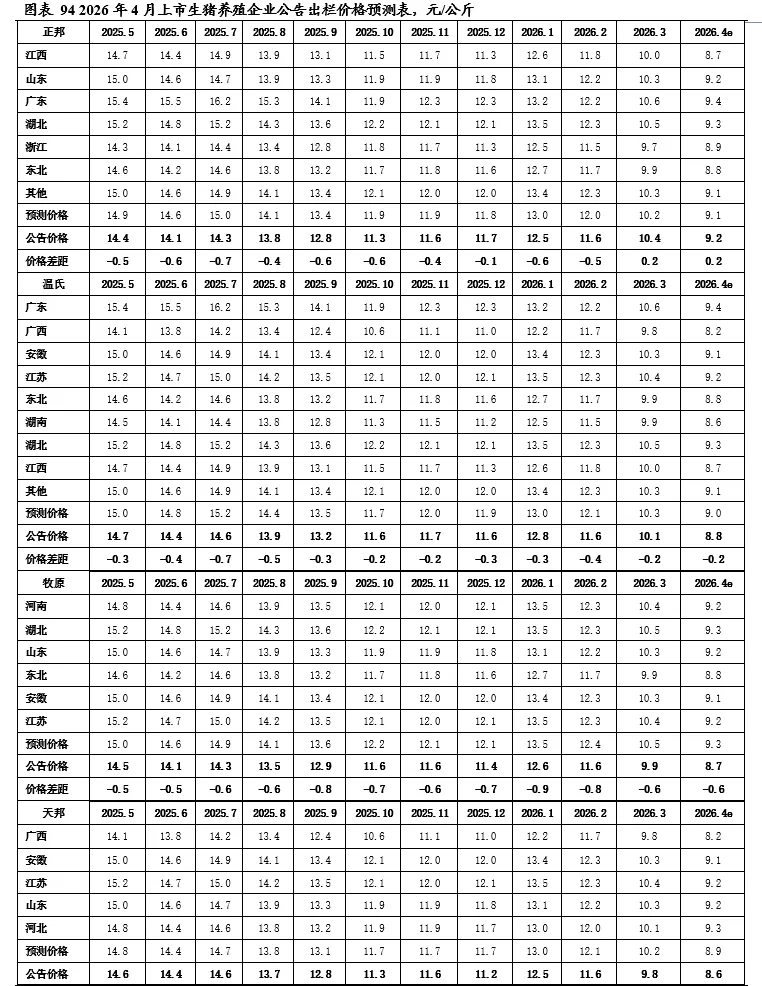 ③2026Q1上市猪企出栏量同比+9.9%。2026年1-3月,17家上市猪企出栏量4,703万头,同比+9.9%;2026年3月,17家上市猪企出栏量1,748万头,同比+11.1%,出栏量(万头)从高到低依次为,牧原675(育肥猪)、温氏368(育肥猪)、新希望151、德康农牧(育肥猪)101、正邦94、天邦食品64、唐人神54、大北农(控股公司)49、巨星农牧46、天康生物33、神农集团32、京基智农22、立华股份19、东瑞17、金新农16、罗牛山8、正虹科技0;出栏量同比增速从高到低依次为,正邦50%、东瑞46%、巨星农牧40%、罗牛山40%、金新农36%、唐人神34%、立华股份29%、温氏28%、天康生物28%、大北农(控股公司)27%、天邦食品20%、德康农牧18%、京基智农16%、牧原-3%、新希望-3%、神农集团-8%、正虹科技-76%。