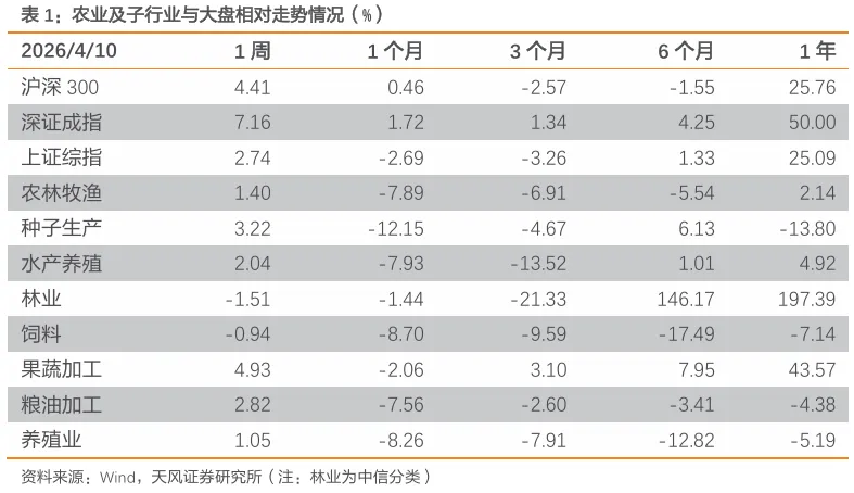 1. 生猪板块:产能去化提速迹象已现,重视去化主升浪。1)产能去化提速迹象已现,重视去化主升浪。在持续低迷的猪价下,养殖端累计亏损已超5个月(23年底部周期中商品猪曾亏损约8个月),且本轮新低猪价带来的头均亏损已超过23年底部周期阶段。具体来看,本周周度猪价跌破9元/kg,自繁自养平均头均养殖亏损达400元以上;同时,本周仔猪亏损延续,头均亏损达78元。在仔猪和育肥双亏的背景下,资金加速流出,3月能繁母猪存栏量去化提速迹象已现。各样本点数据显示:卓创、钢联、涌益样本点能繁母猪存栏环比分别-0.98%/-0.34%/-0.07%(2月环比-0.35%/-0.02%/+0.39%、累计分别去化-4.9%/-2%/-0.43%)。此外,需持续关注产业全面深度亏损背景下,疫病防范边际下降,是否会重现口蹄疫在猪群中发病态势。2)投资建议:重视本轮猪周期的产能去化加速阶段!我们认为,亏损持续放大叠加仔猪再度亏损下,过冬压力突出,供给过剩产能去化,且去化加速的逻辑持续兑现。个股方面,反内卷下出栏弹性系统性收窄,建议关注经营稳定、成本优秀的“好”公司:【牧原股份】、【温氏股份】、【德康农牧】,相关标的:【神农集团】、【立华股份】、【巨星农牧】、【天康生物】、【华统股份】、【新希望】等。从2026年头均市值来看:神农集团3000+元/头,牧原股份、华统股份2000+元/头;德康农牧、温氏股份、立华股份1500-2000元/头;天康生物、巨星农牧、新希望等1500元/头以内;估值处在历史相对底部区间(数据截至2026年4月10日)。