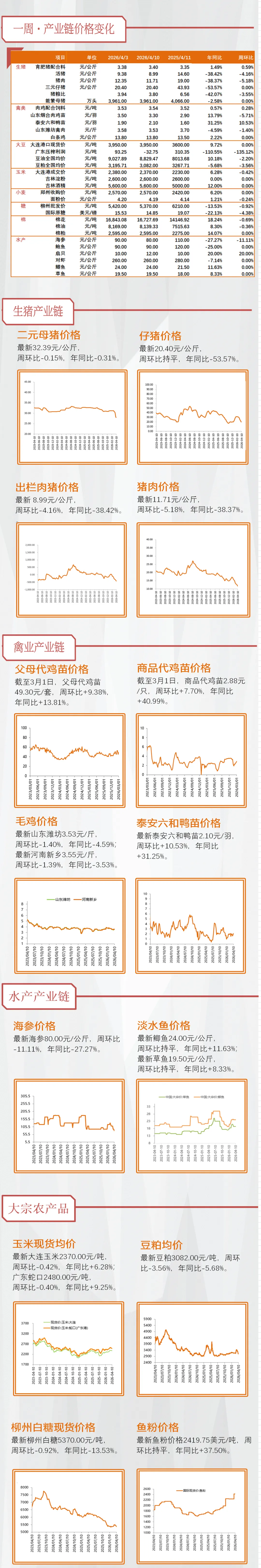 ②养殖端看空后市,补栏积极性下降,散户空栏观望为主,苗价承压下滑。截至4月11日,山东大厂商品代苗报价3.45元/羽(取区间中值),环比-0.20元/羽;山东区域主流毛鸡均价3.50元/斤,环比-0.05元/斤(数据来源:家禽信息PIB)。