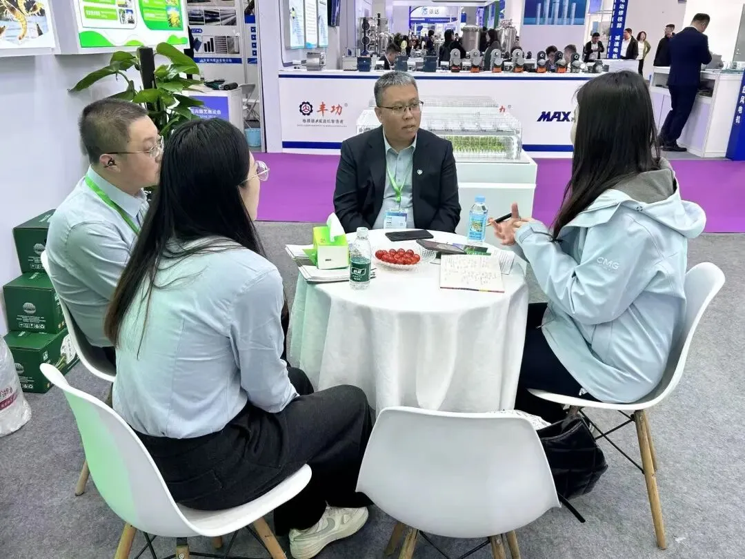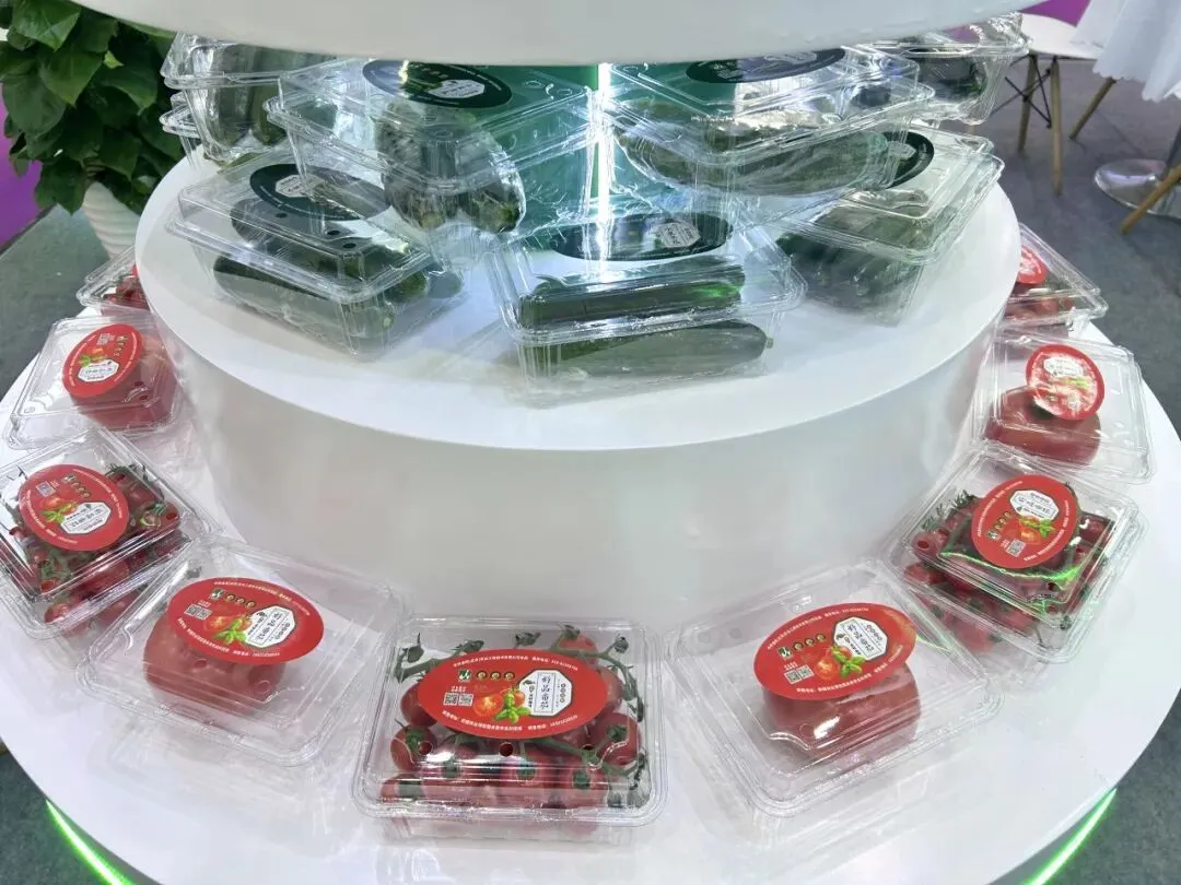 展位设计简约现代,功能分区明确,设有沙盘展示区、番茄黄瓜品鉴区、洽谈交流区及礼品互动区,吸引了大批海内外客商驻足观摩,展位人气持续高涨。