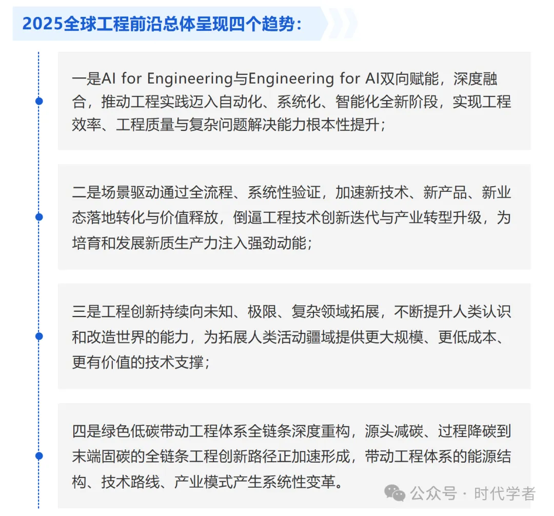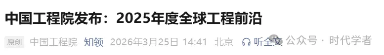 3月25日,2026中关村论坛年会在京开幕。中国工程院李晓红院长在开幕式发布“2025全球工程前沿”。2025全球工程前沿总体呈现四大趋势,在9个领域共遴选出94个工程研究前沿和95个工程开发前沿。