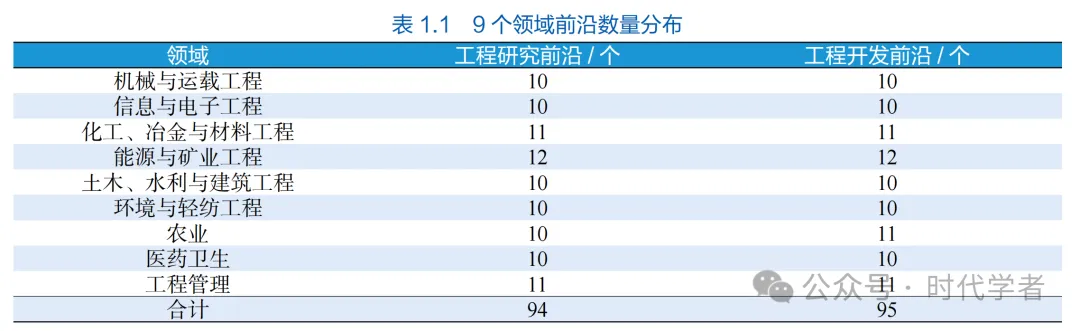 中国工程院自2017年起每年组织院士专家开展“全球工程前沿”研究,按照9个领域方向,通过数据挖掘、专家交互、研判遴选,获得90个左右工程研究前沿和90个左右工程开发前沿。研究成果按年度以中英文面向全球发布,有效发挥了学术引领、产业引导和决策参考的作用,受到了国内外社会各界的广泛关注和积极评价。本次成果发布是全球工程前沿首次亮相中关村论坛。2025年度全球工程前沿研究采用专家与数据多轮交互、迭代遴选研判的方法,各领域前沿数量分布如表1.1所示。
