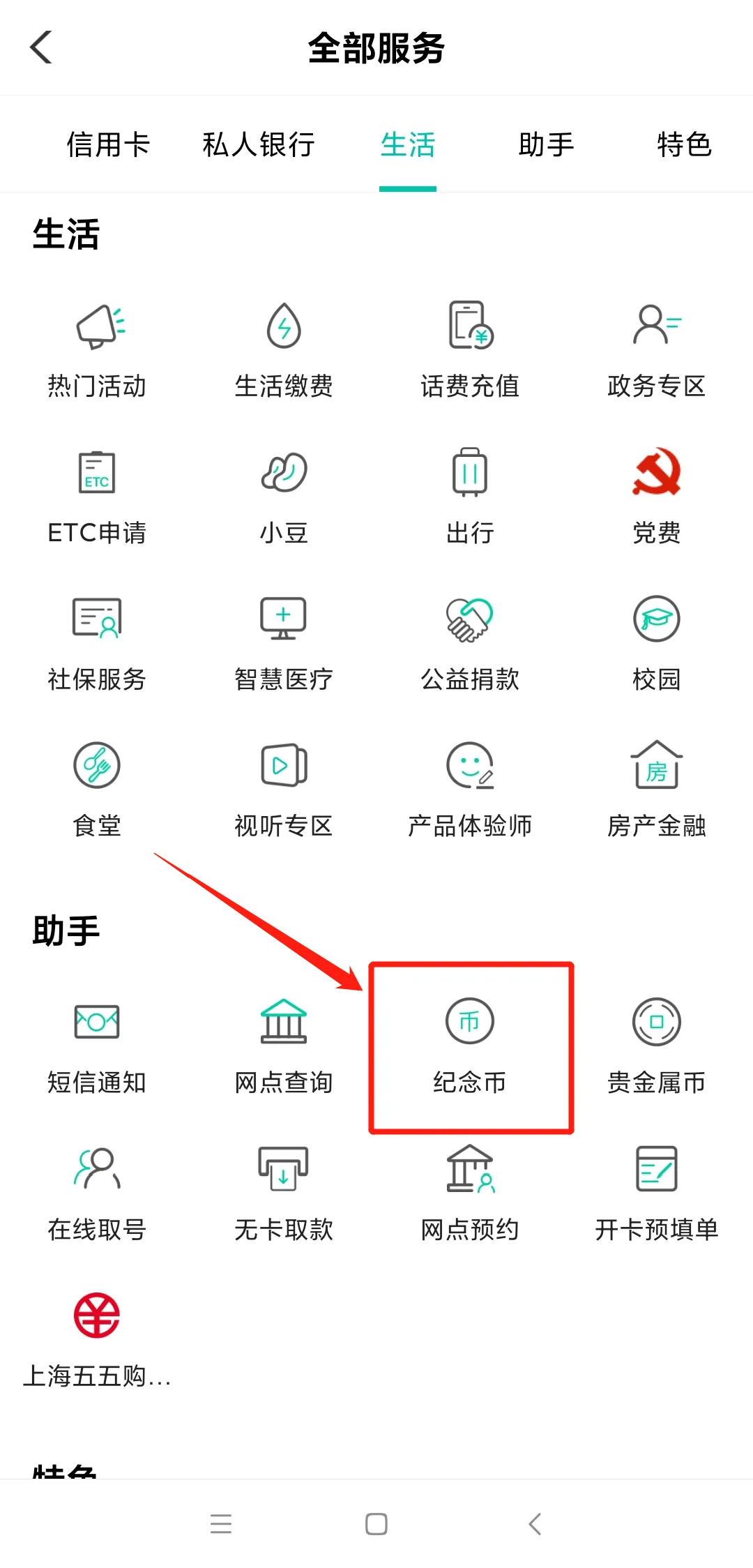 第二步:打开 APP→点首页“全部”→下拉找到“助手”→点击“纪念币”。