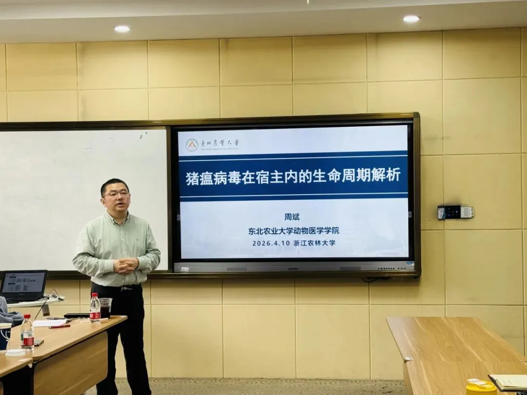 周斌教授长期从事猪重要疫病发病机制与防控技术研究,整场报告内容详实、深入浅出,现场师生交流踊跃、反响热烈,不仅进一步加深了大家对动物病毒生命周期的认知,也为学院科研工作拓展了思路、注入了新活力。
