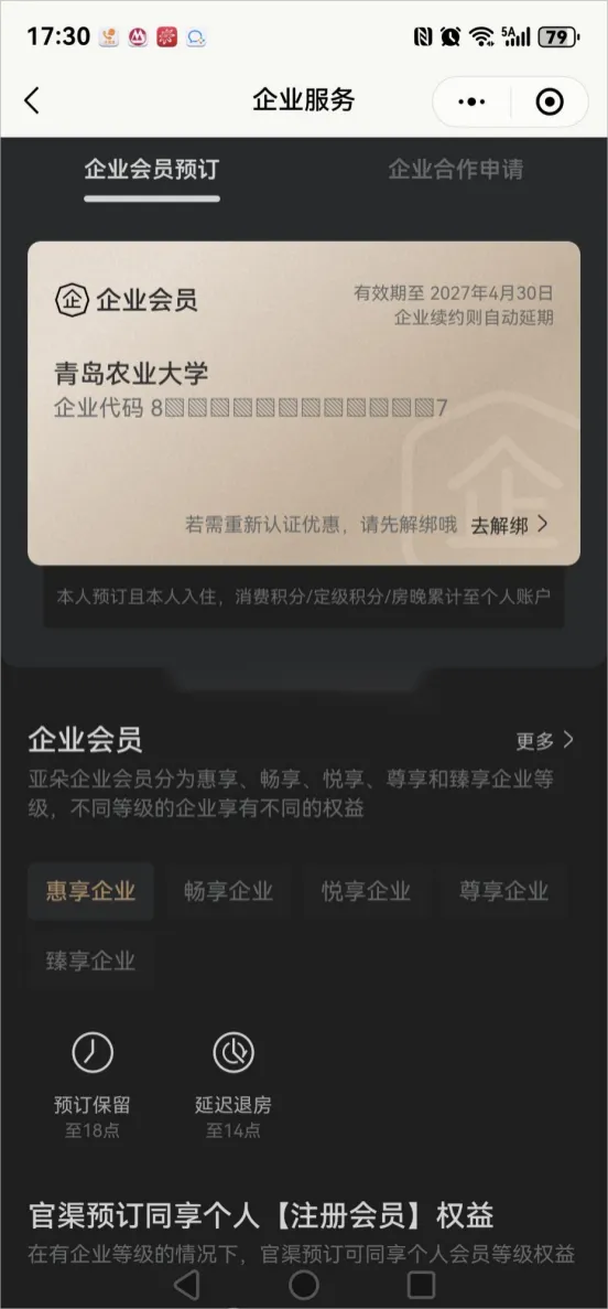 输入验证码后(可能出现第一次发验证码收不到,再重新发送一次即可),返回首页再次点击“企业专享”显示青岛农业大学即为绑定成功,预定酒店即可专享青岛农大师生专属协议价格和个人会员消费积分。