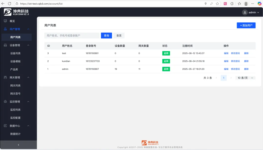管理后端页面截图,客户端支持微信小程序,搜索演示“坤典物联网”,客户端采用uniapp跨平台开发,支持打包安卓、IOS、H5等平台