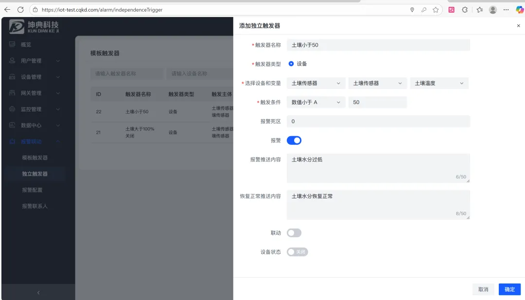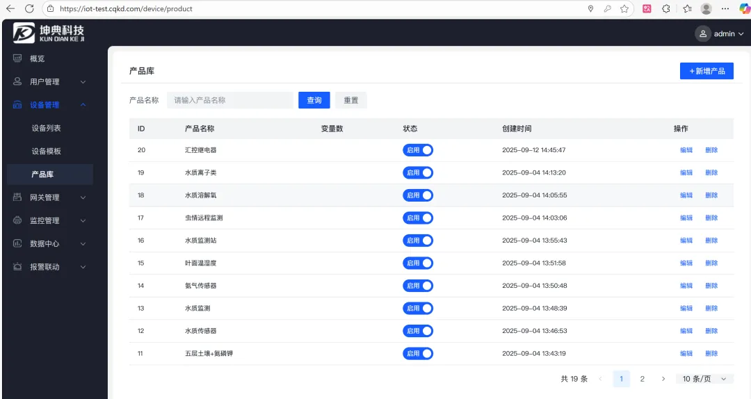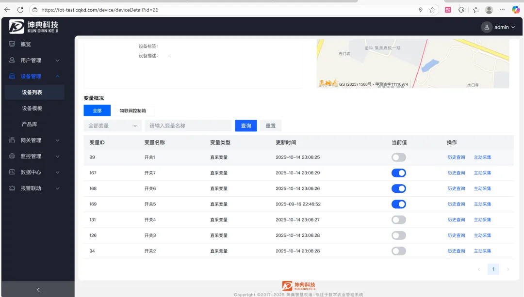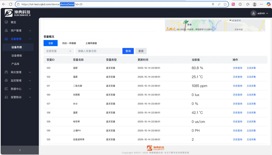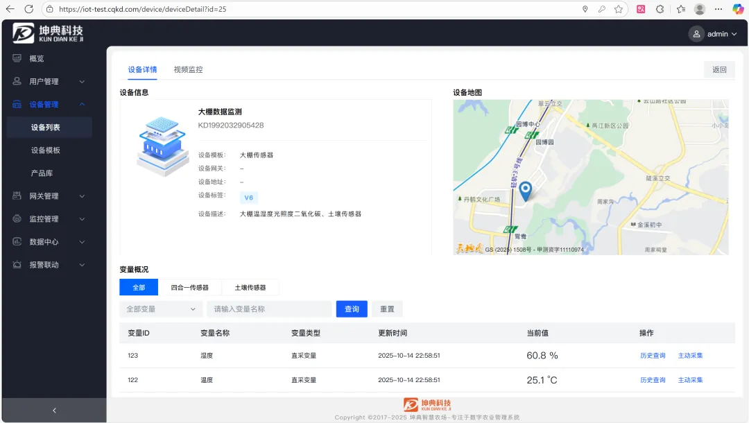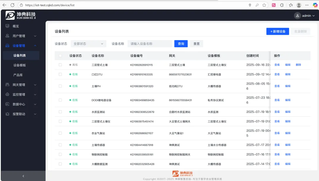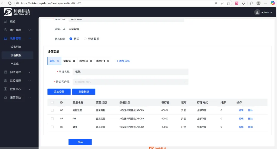 - 设备管理:支持利用TCP协议从设备实时采集数据,支持modbusRTU协议,绑定传感器模板即可采集