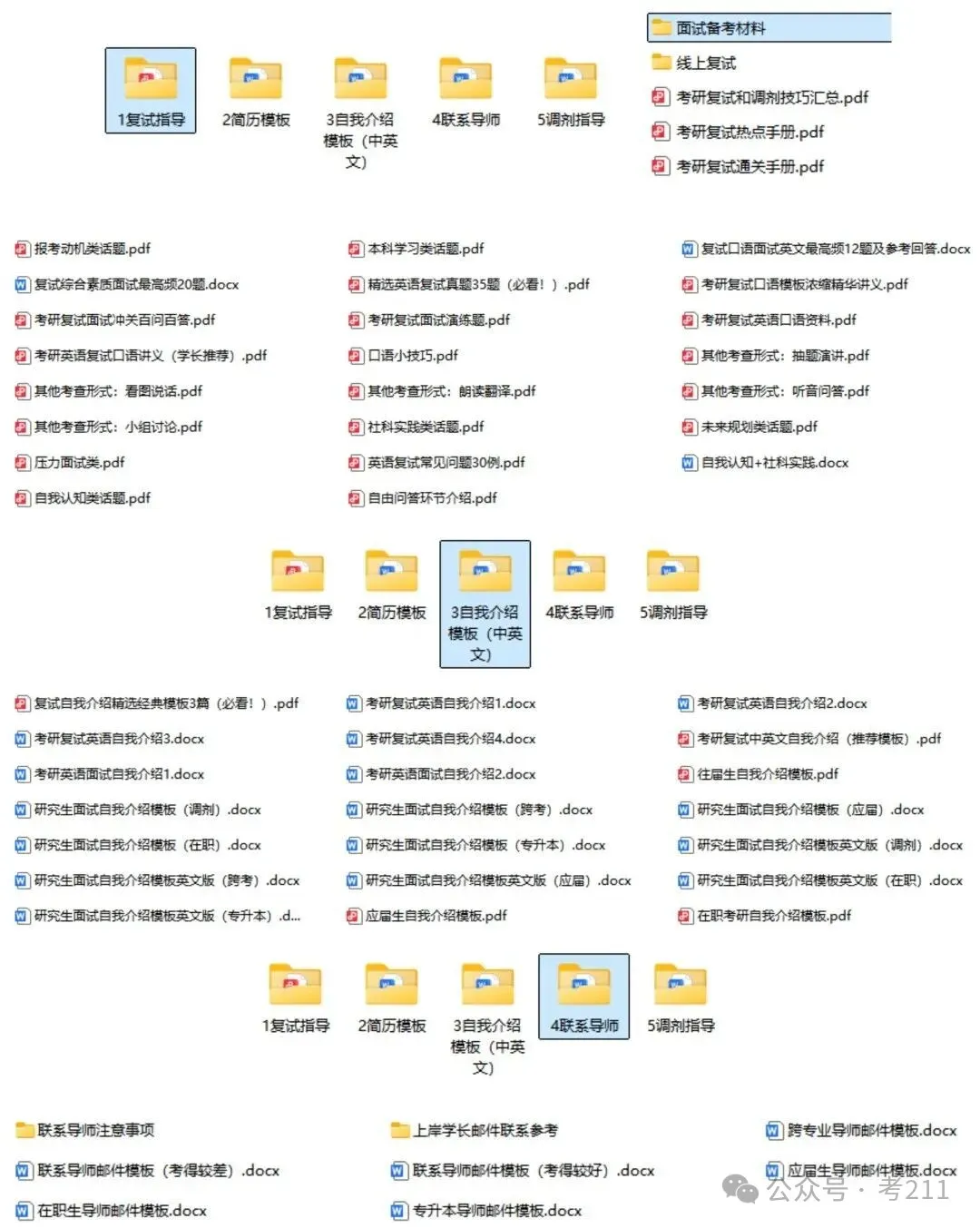 获取方式——点击以下名片或搜索关注公众号【考211】,在对话框发送关键词【211】,进入小程序后找到【硕士】——【考研复试调剂】——【0考研复试通用包】文件夹免费下载: