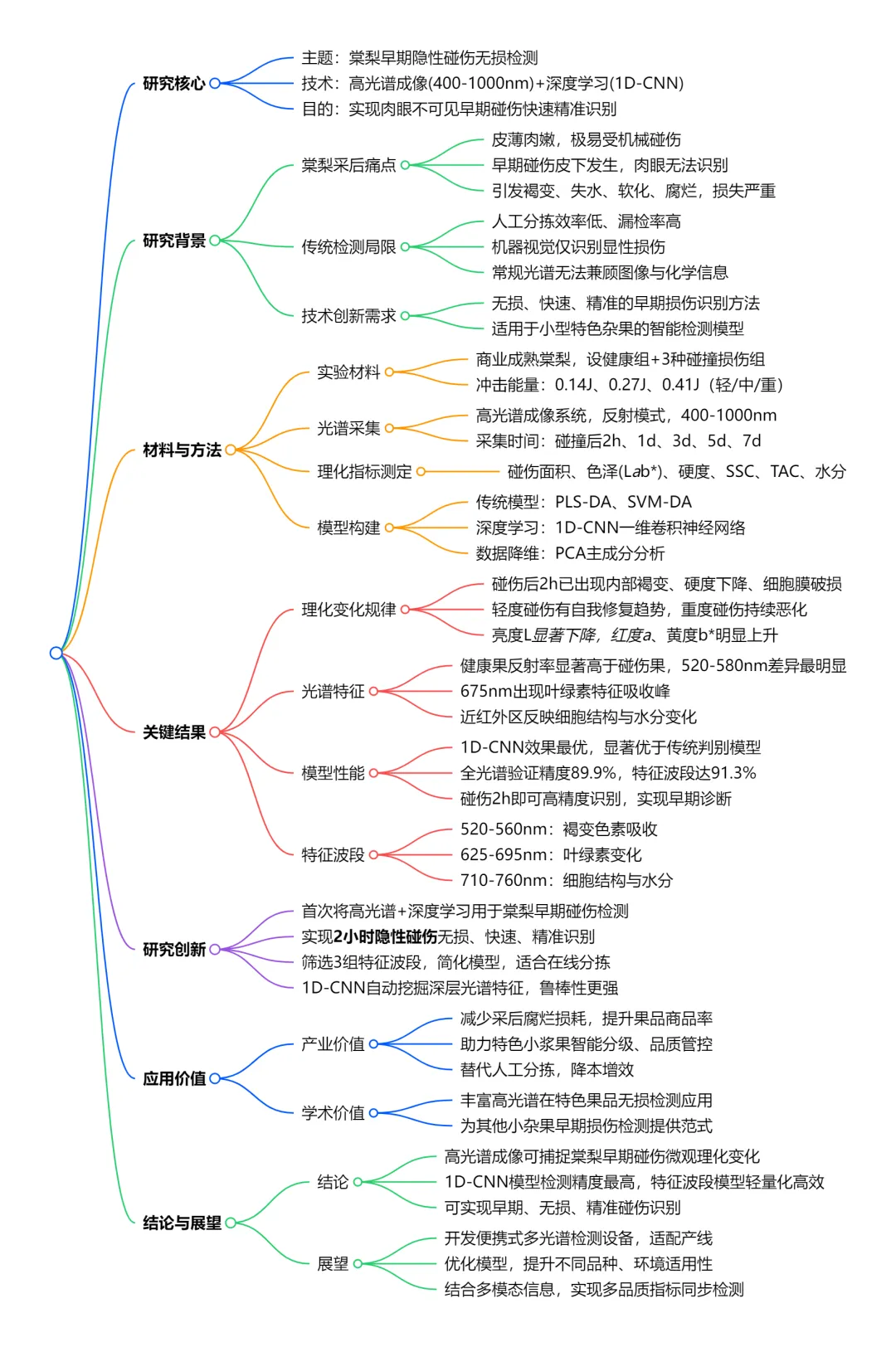 该研究首次将高光谱成像与深度学习联合应用于棠梨早期隐性碰伤识别,填补了小众特色小果无损检测领域的研究空白。与传统线性判别方法相比,所采用的深度学习策略能够自动挖掘光谱中的深层关联信息,大幅提升早期微弱信号的识别能力。同时,研究通过多变量分析明确了光谱特征与果实生理变化之间的对应关系,从机理层面解释了早期碰伤检测的科学依据,为同类果实的损伤检测研究提供了可借鉴的范式。