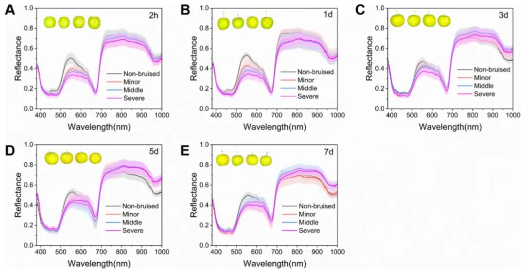 该研究采用可控的损伤处理方式,设置不同程度的机械撞击条件,模拟实际流通中的磕碰情况,并在不同贮藏时间点采集高光谱信息与理化指标变化。研究团队先对果实的色泽、质地、水分等关键品质变化进行系统分析,明确早期碰伤带来的内在生理改变;再对光谱数据进行预处理、特征提取与降维分析,确定与损伤高度相关的敏感波段;最后构建多种判别模型进行对比,筛选出识别效果最好的深度学习模型,并验证特征波段组合的轻量化应用潜力。