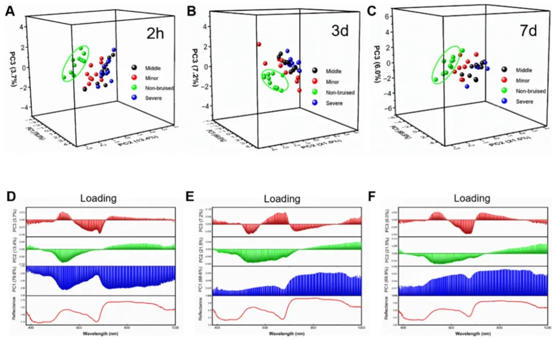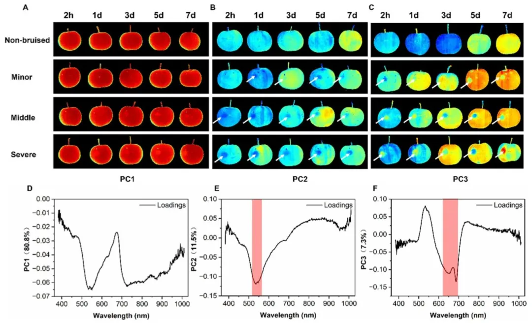 图 4 贮藏期间不同碰伤程度苹果在可见 / 近红外波段的平均光谱曲线图 6 基于可见 / 近红外光谱的棠梨贮藏期间不同碰伤程度的PCA 分析图 7 PCA 映射与载荷分析结果A:五个贮藏时段下由高光谱数据立方体获得的 PC1、PC2、PC3 图像;白色箭头指示碰伤区域;D、E、F 为载荷图,红色阴影标出了重要波长波段