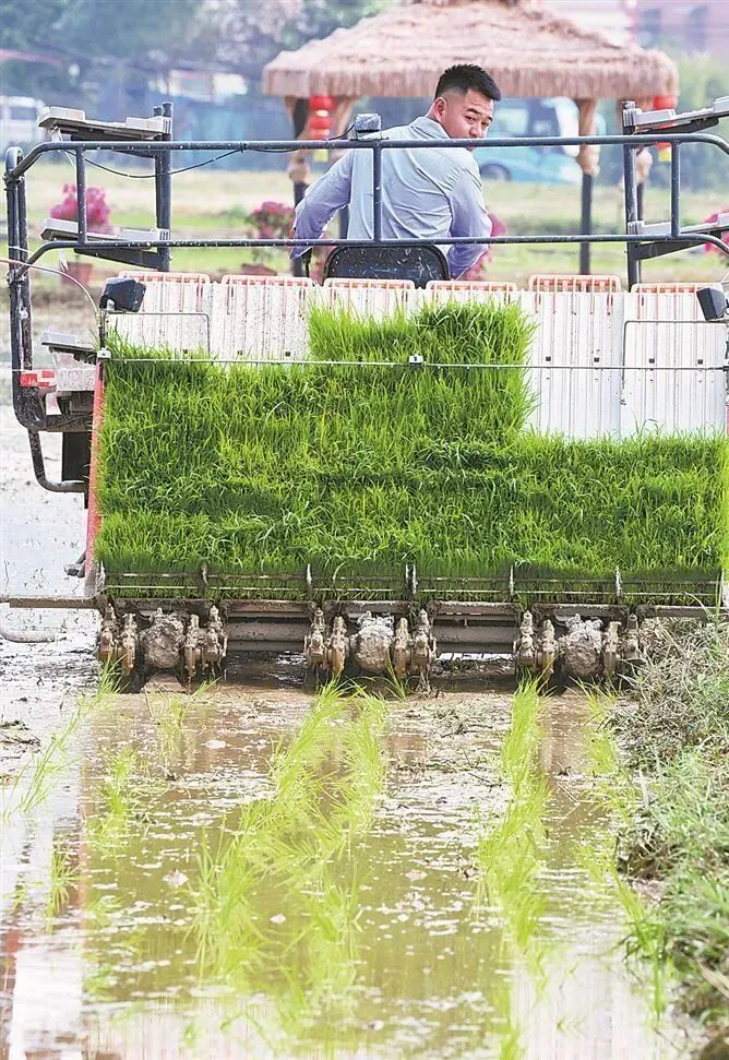 农田上空,农业无人机表演绝活。水田里,乘坐式高速插秧机匀速往来穿梭,将秧苗精准植入水田,栽种的秧苗疏密均匀、深浅一致。相较于传统人工插秧,机械化插秧效率提升数十倍。起垄播种覆膜一体机登场,起垄、播种、覆膜“一气呵成”,省时又省力。