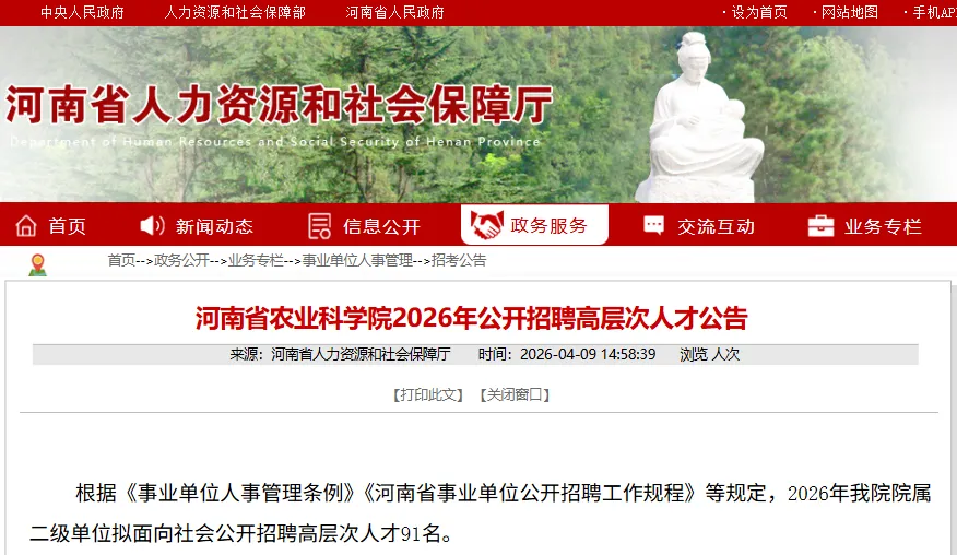 招聘信息同时发布在河南省人力资源和社会保障厅和河南省农业科学院网站